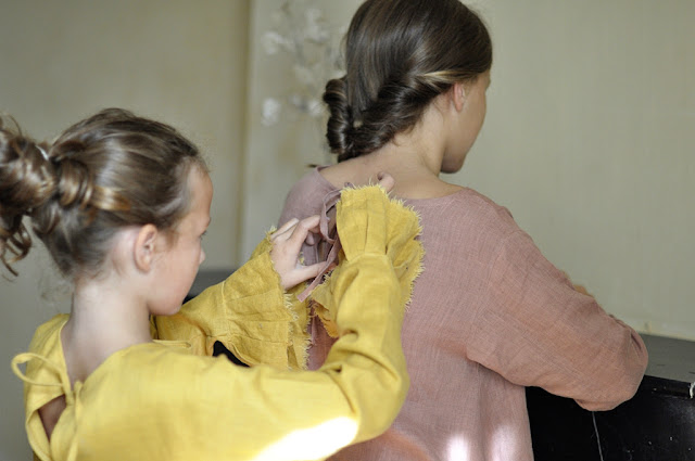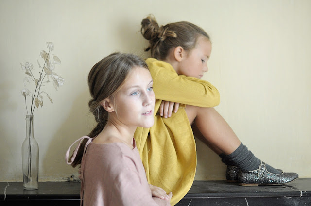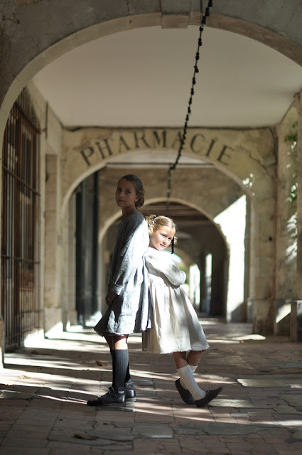 A l'ombre du jardin, Theo porte sa barboteuse JOSHUA et Amelia la robe ROSIE, tunique longue ou robe très courte conçue pour être portée avec un bloomer et (ou) le petit tablier AMELIA comme on peut le voir ci-dessous :