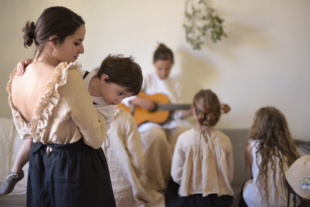 Rose(de dos) porte une robe CRICRI et un jupon en lin. Camille(à droite) porte une robe LEONTINE